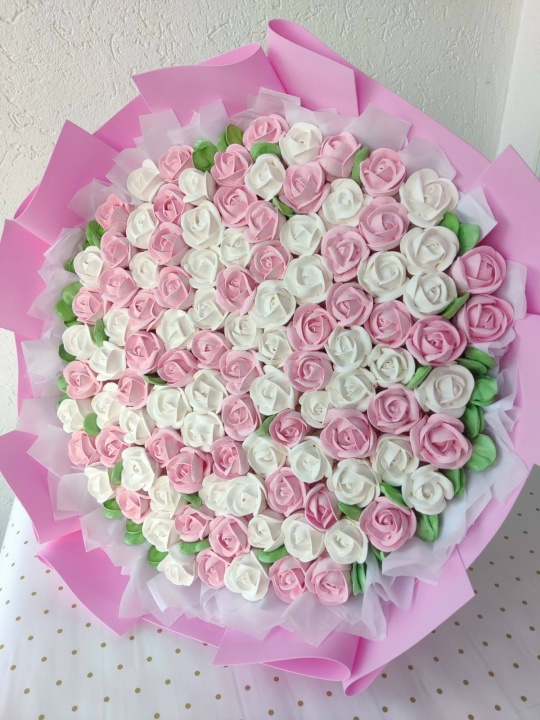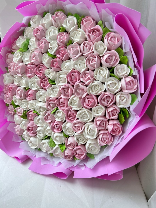 101 зефирная роза. Зефир на пюре из свежих яблок с уменьшенным содержанием сахара. Зефир нежный и воздушный. Диаметр готового букета 50 см. Срок хранения 14 дней. Заказ минимум за 3 дня.
