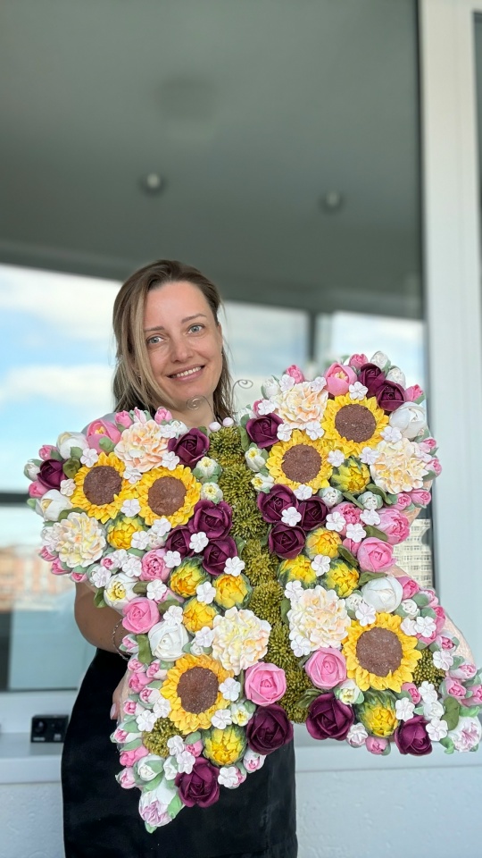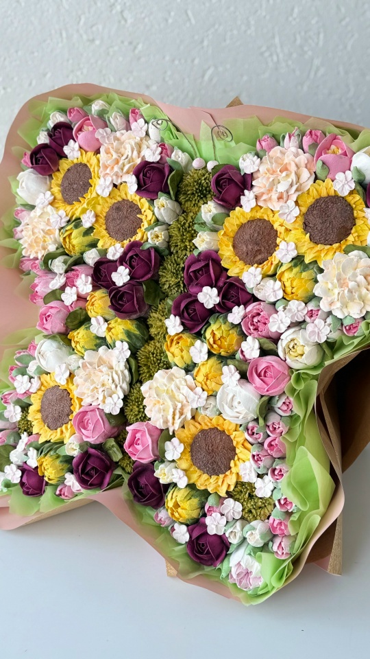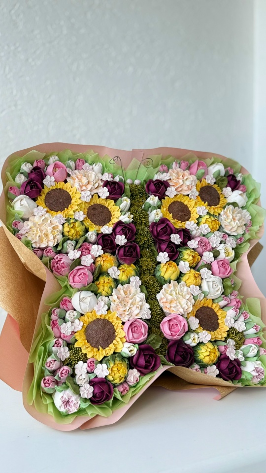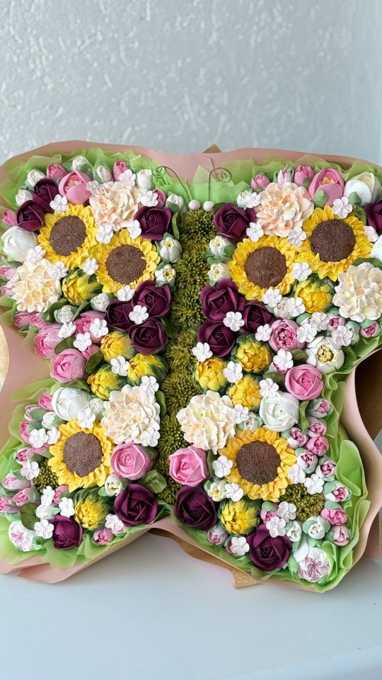 Очень большой букет в виде бабочки с цветами из зефира на пюре из свежих яблок с уменьшенным содержанием сахара. Зефир нежный и воздушный. Букет упакован в прозрачную слюду. Таким букетом вы вызовете удивление и восторг. Заказ минимум за 5 дней.