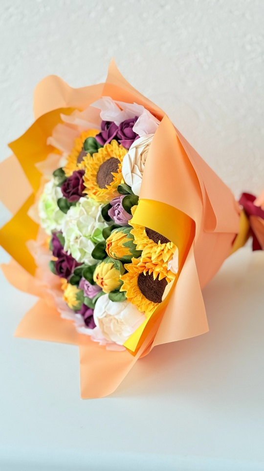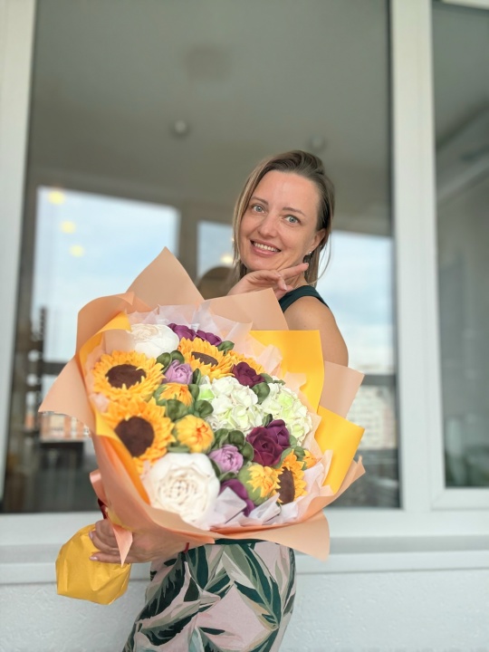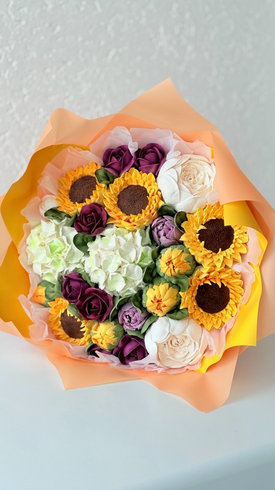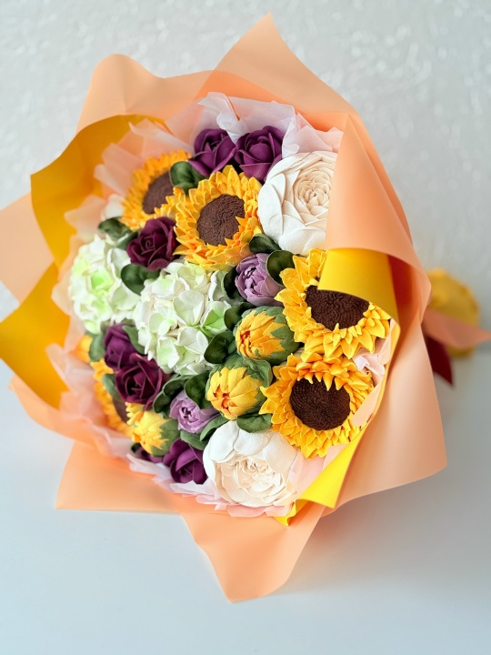 Букет с цветами из зефира на пюре из свежих яблок, с уменьшенным содержанием сахара. Зефир нежный и воздушный. Размер основания под цветы 27 см, диаметр готового букета по упаковке примерно 40 см