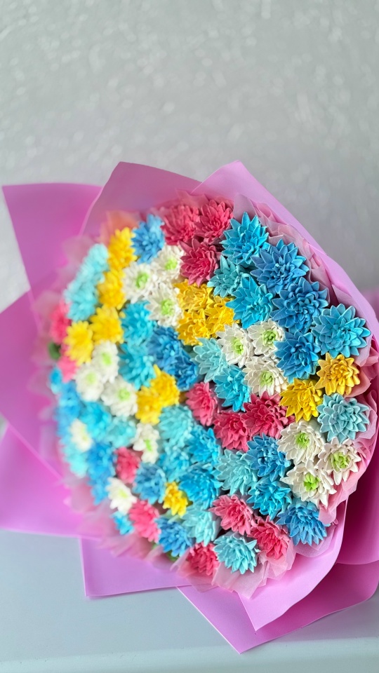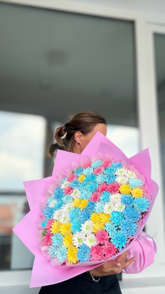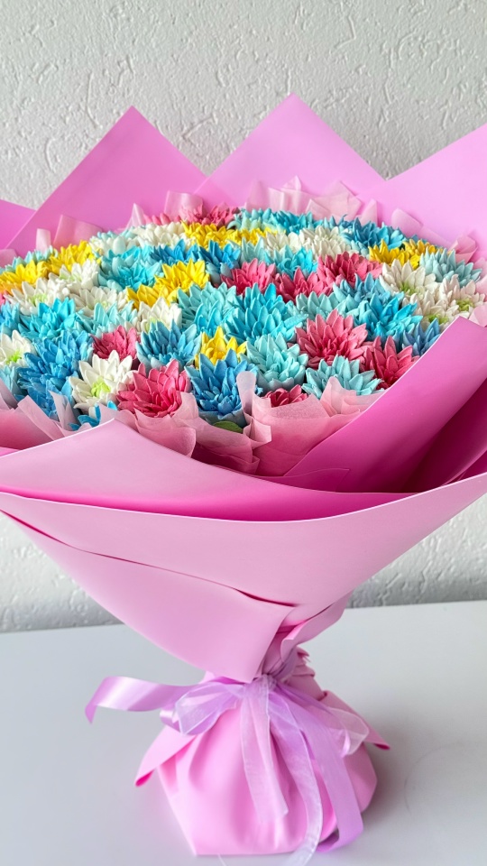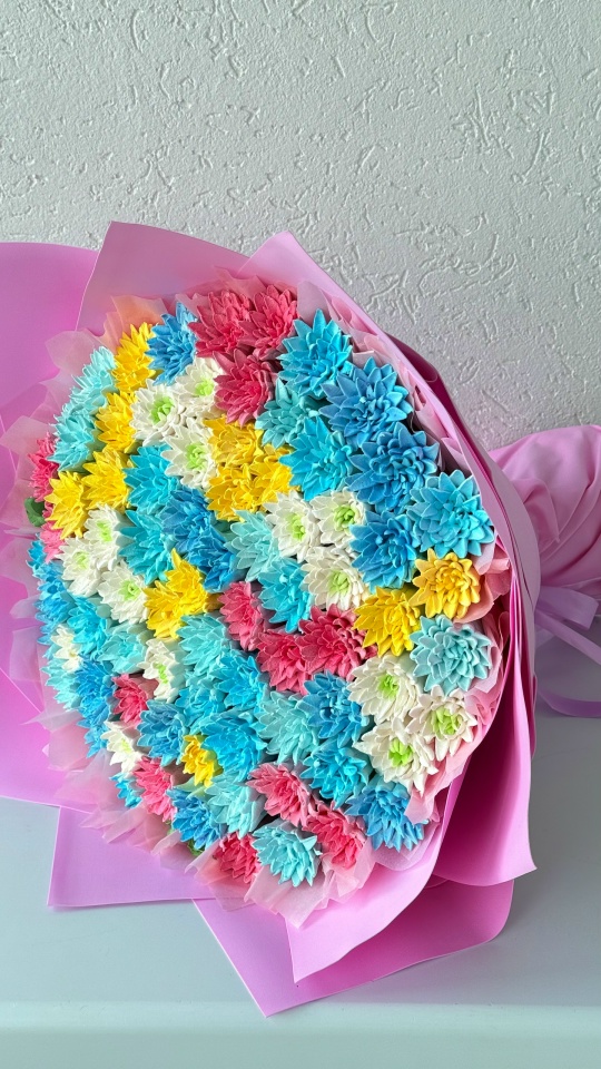 Букет хризантем из зефира на пюре из яблок с уменьшенным содержанием сахара. Зефир нежный и воздушный. Диаметр букета по цветочной шапке 40 см плюс упаковка дает дополнительный объем. Расцветку цветов можно сделать на ваш выбор.