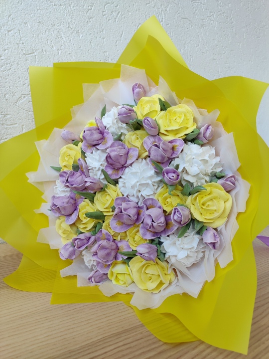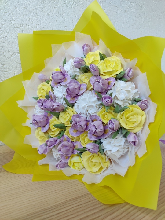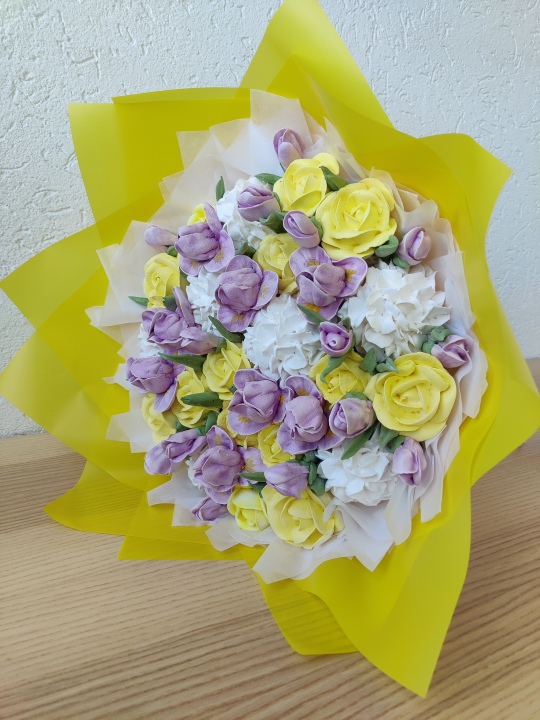 Букет "Ирисы" с цветами из зефира на пюре из свежих яблок. Зефир нежный и воздушный. Диаметр основания букета 24 см, готовый букет примерно 30 см.