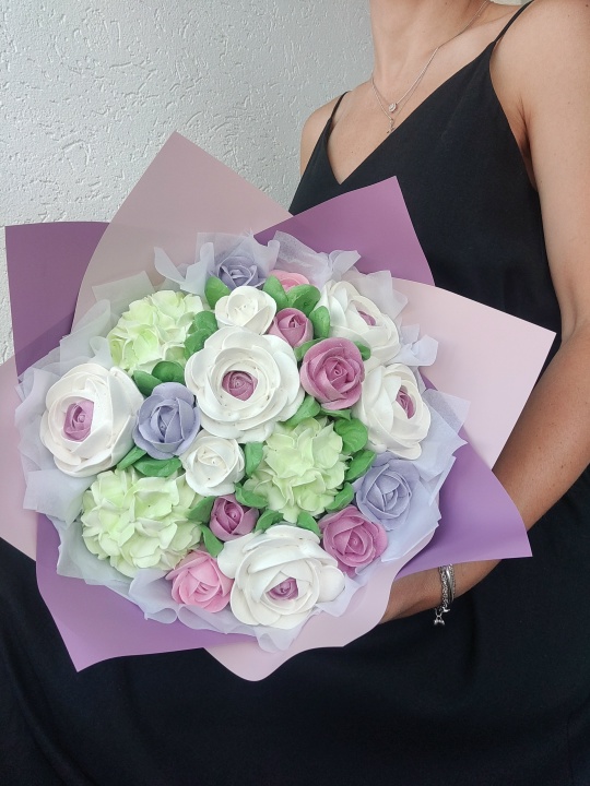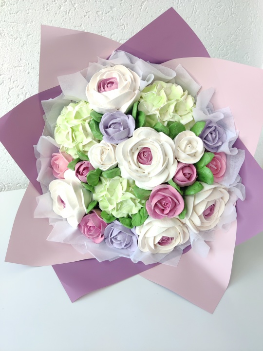 Букет из зефира на пюре из свежих яблок с уменьшенным содержанием сахара. Зефир нежный и воздушный. Диаметр готового букета по упаковке примерно 30 см. Букет сверху упакован в прозрачную слюду. Зефир хранится при комнатной температуре.