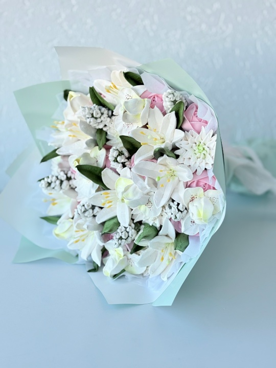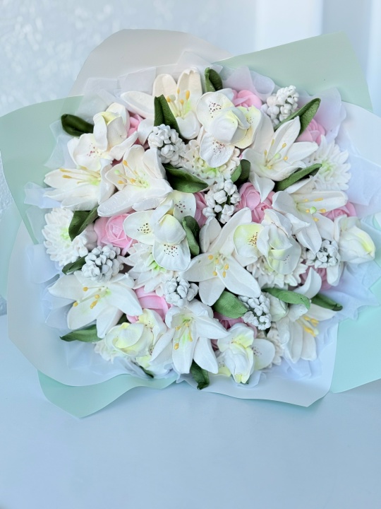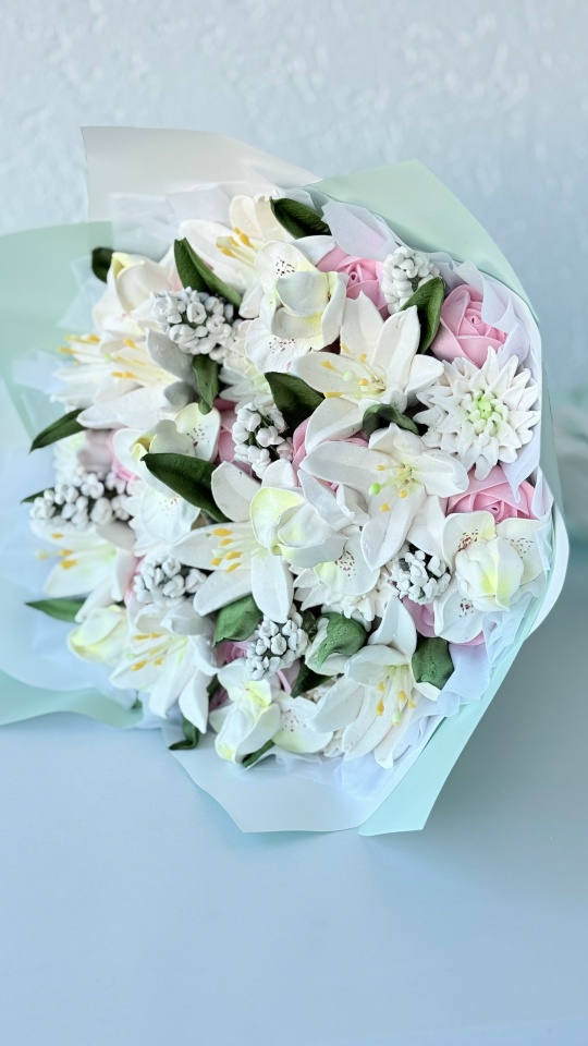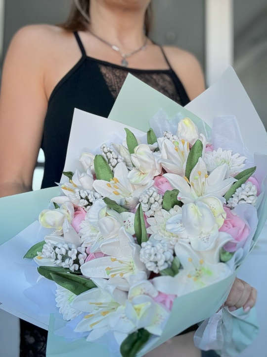 Букет с цветами из зефира на пюре из свежих яблок с уменьшенным содержанием сахара. Зефир нежный и воздушный. Размер М, диаметр готового букета 30 см