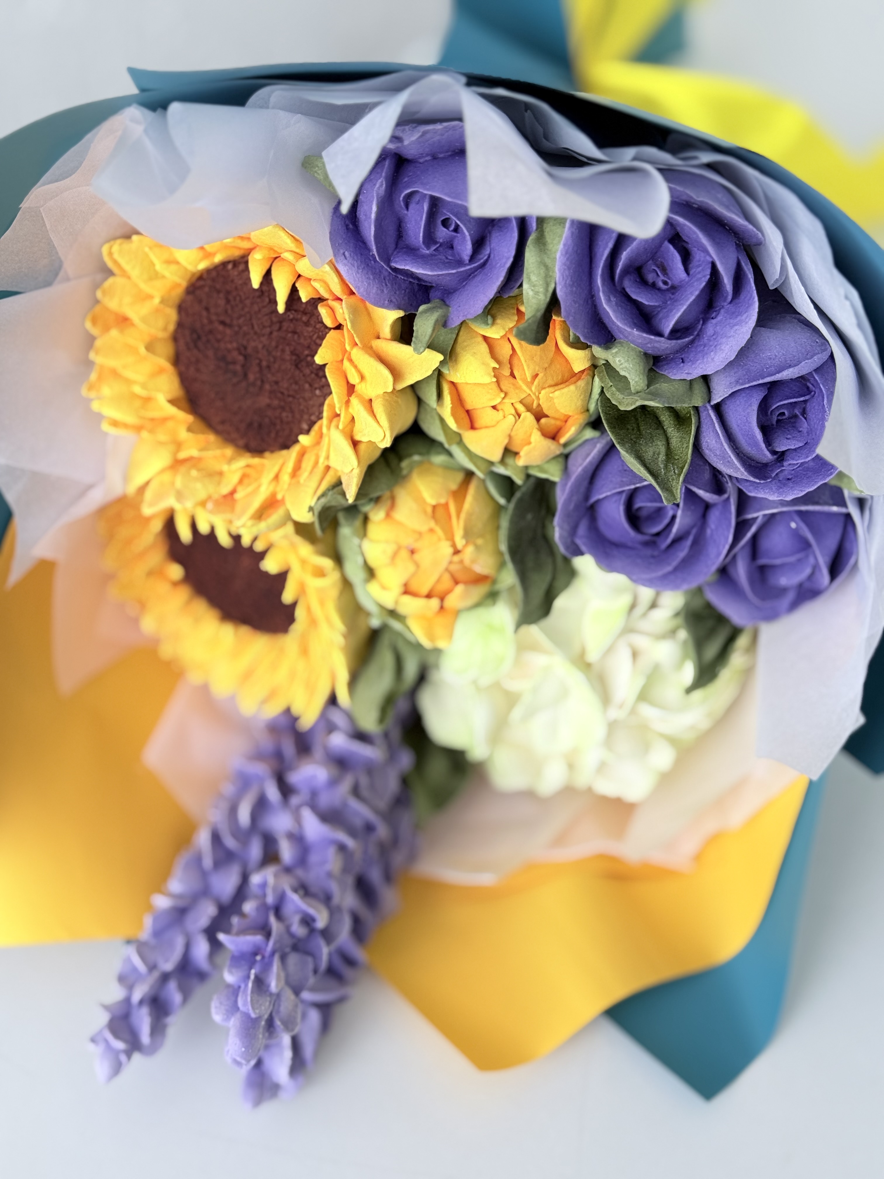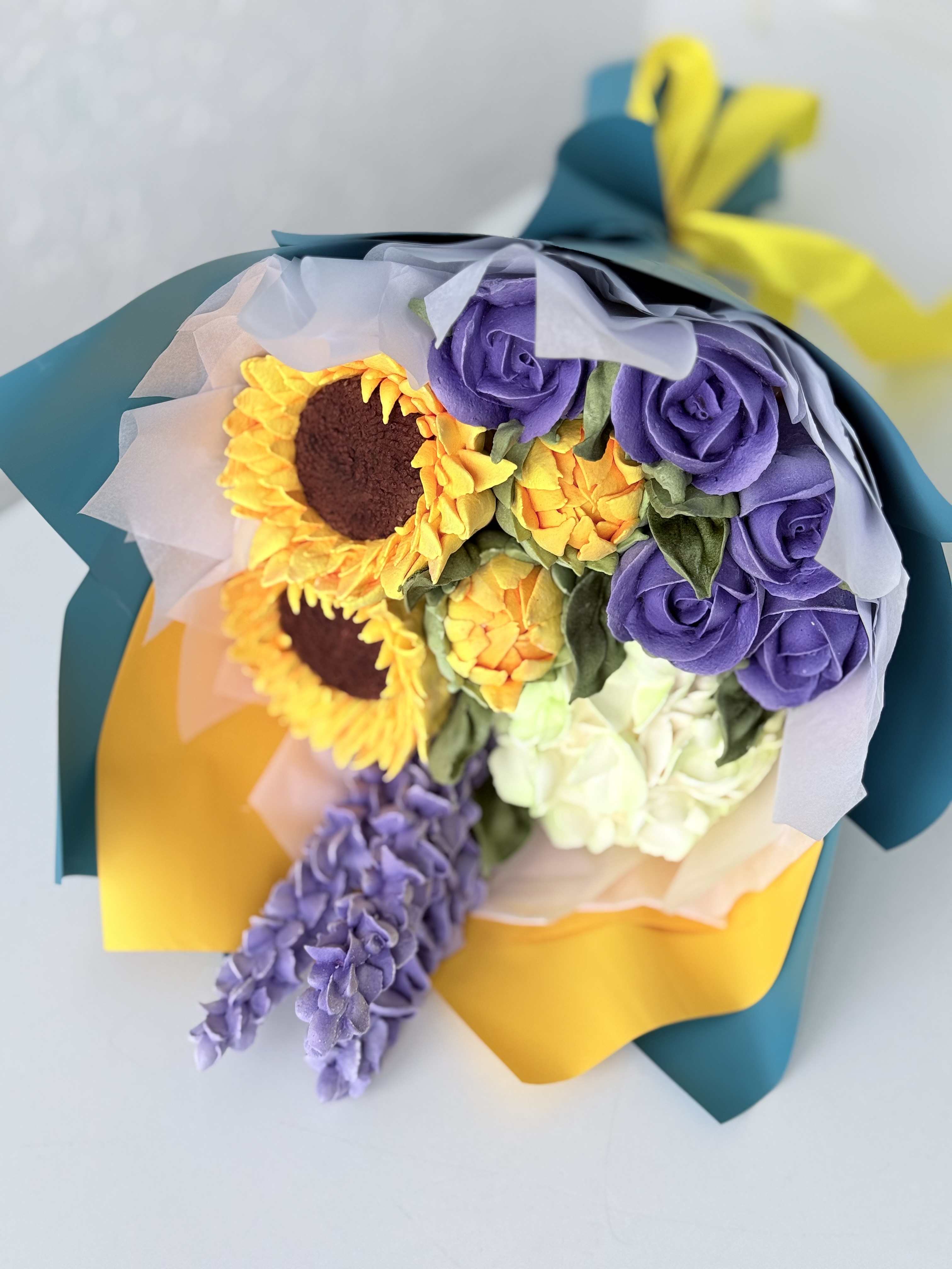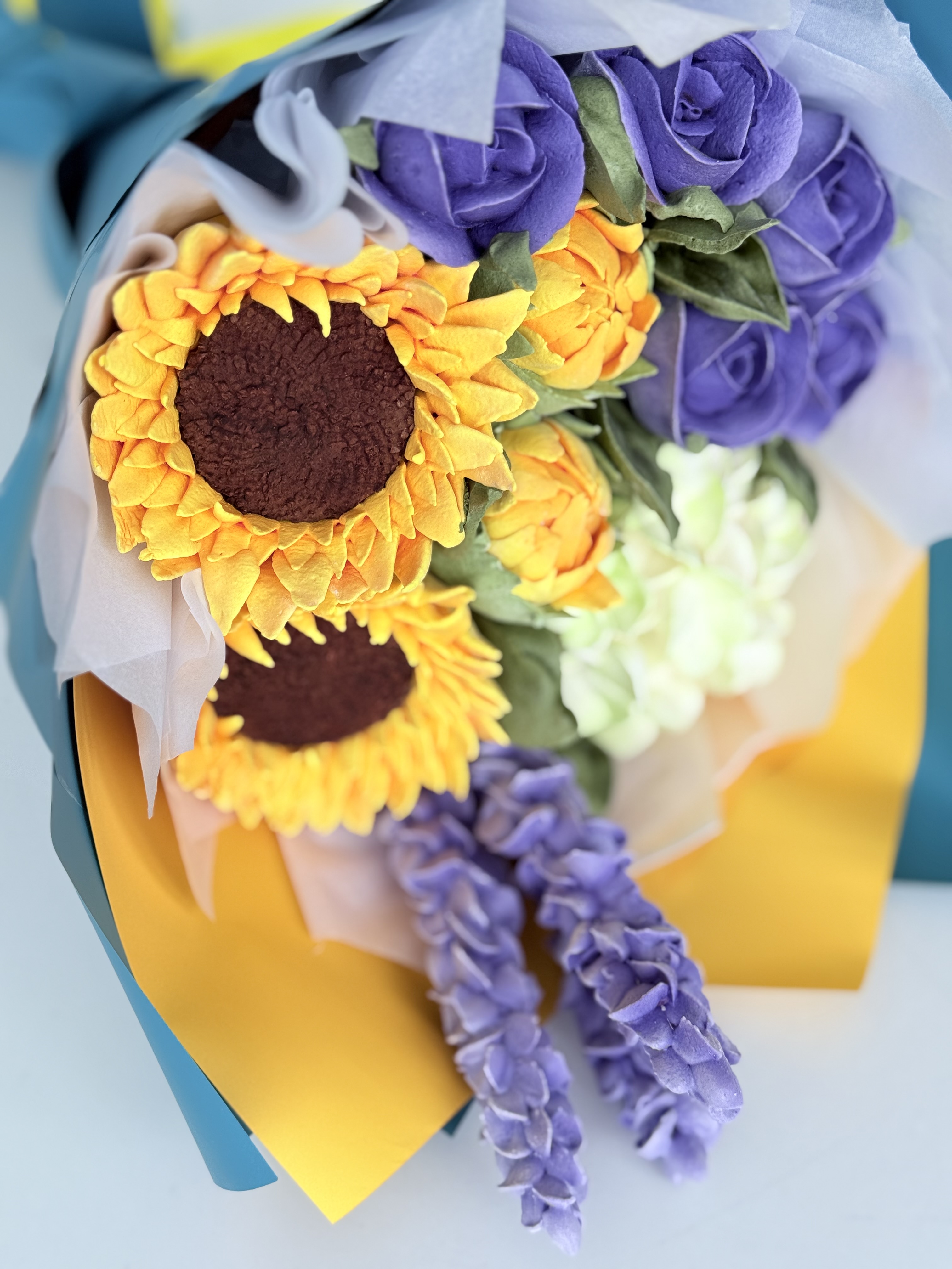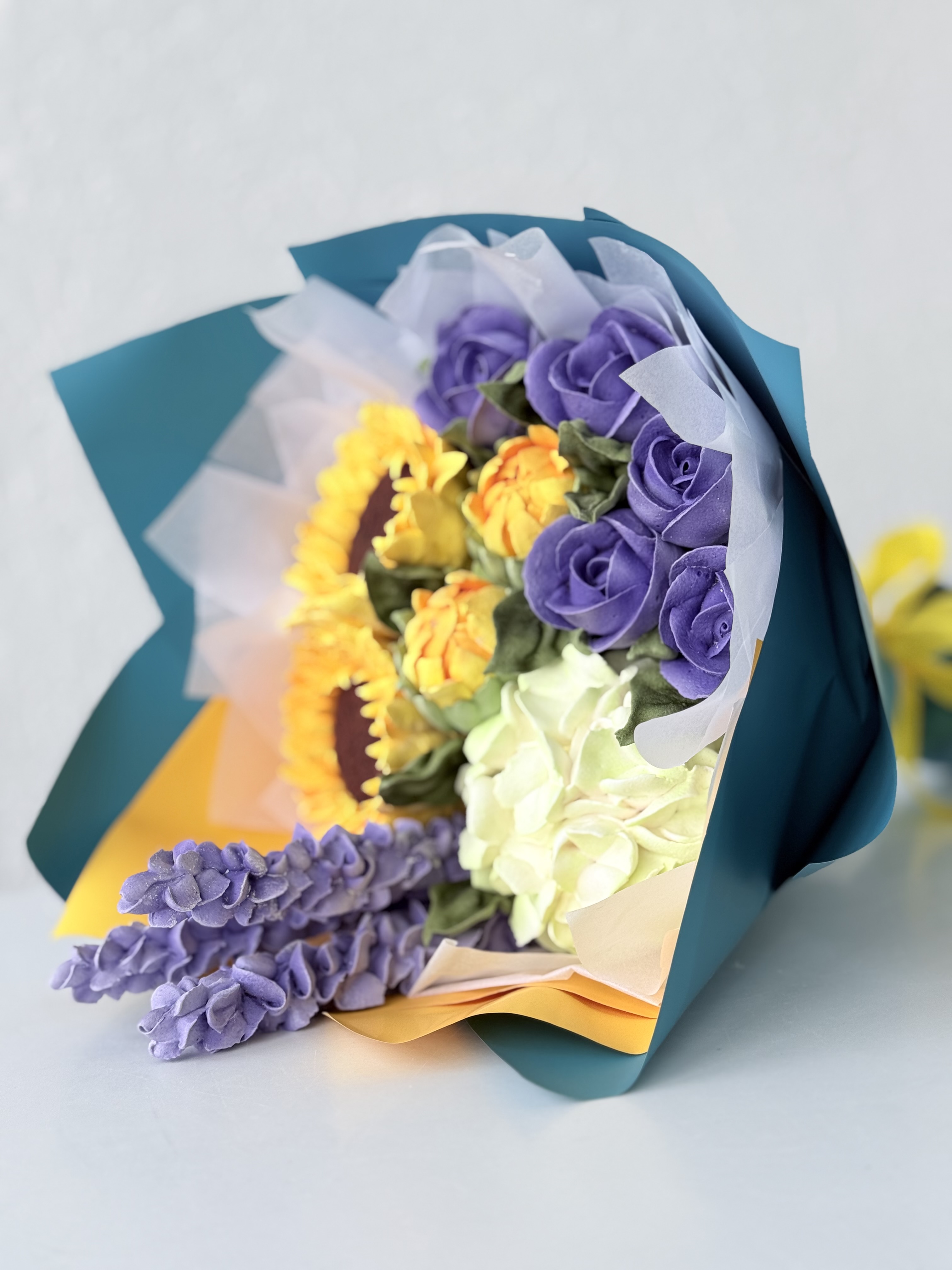 Яркий букет с цветами из зефира на яблочном пюре, с уменьшенным содержанием сахара. Зефир нежный и воздушный. Такой букет прекрасно подойдет на 1 сентября, День учителя или день воспитателя. Основа под цветы 16 см (размер S). Диметр готового букета + (5-10 см). Цветы крепятся на зубочистки. Композиция упакована в прозрачную слюду для транспортировки.
