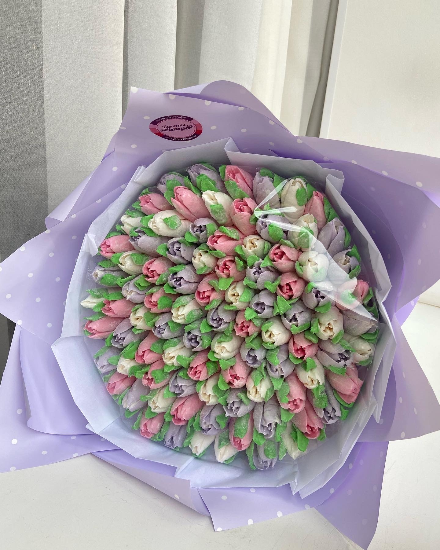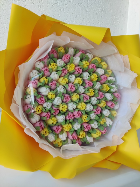 Букет с тюльпанами из зефира с уменьшенным содержанием сахара на пюре из свежих яблок. Размер L 24 см основа под цветы. Расцветку цветов можно выбрать.