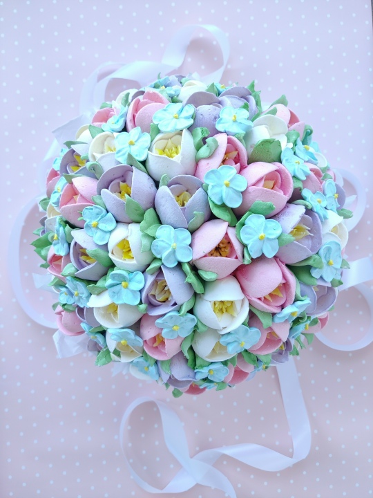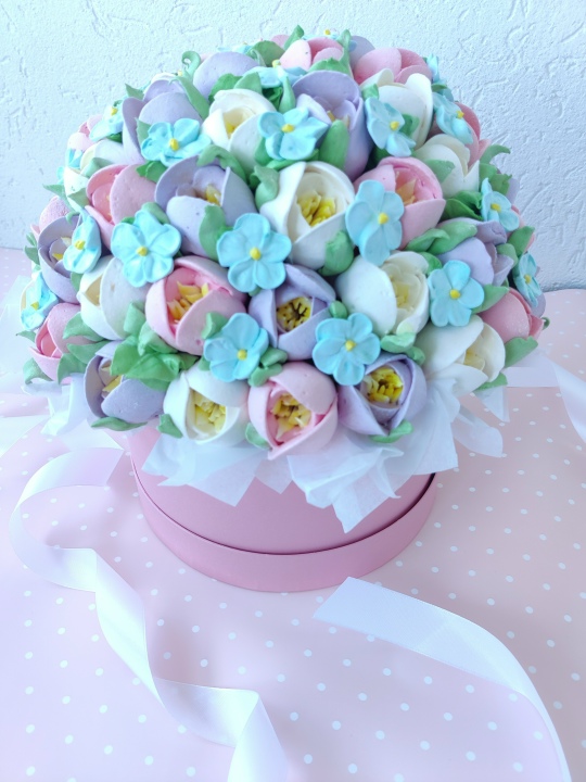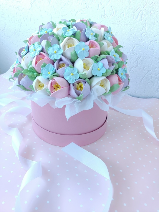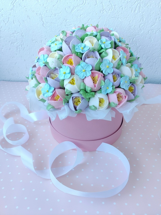 Коробка d 20 см с цветами из зефира на пюре из свежих яблок с уменьшенным содержанием сахара. Цветов примерно 59 шт. По желанию можно добавить шоколадную фигурку за доп. плату.