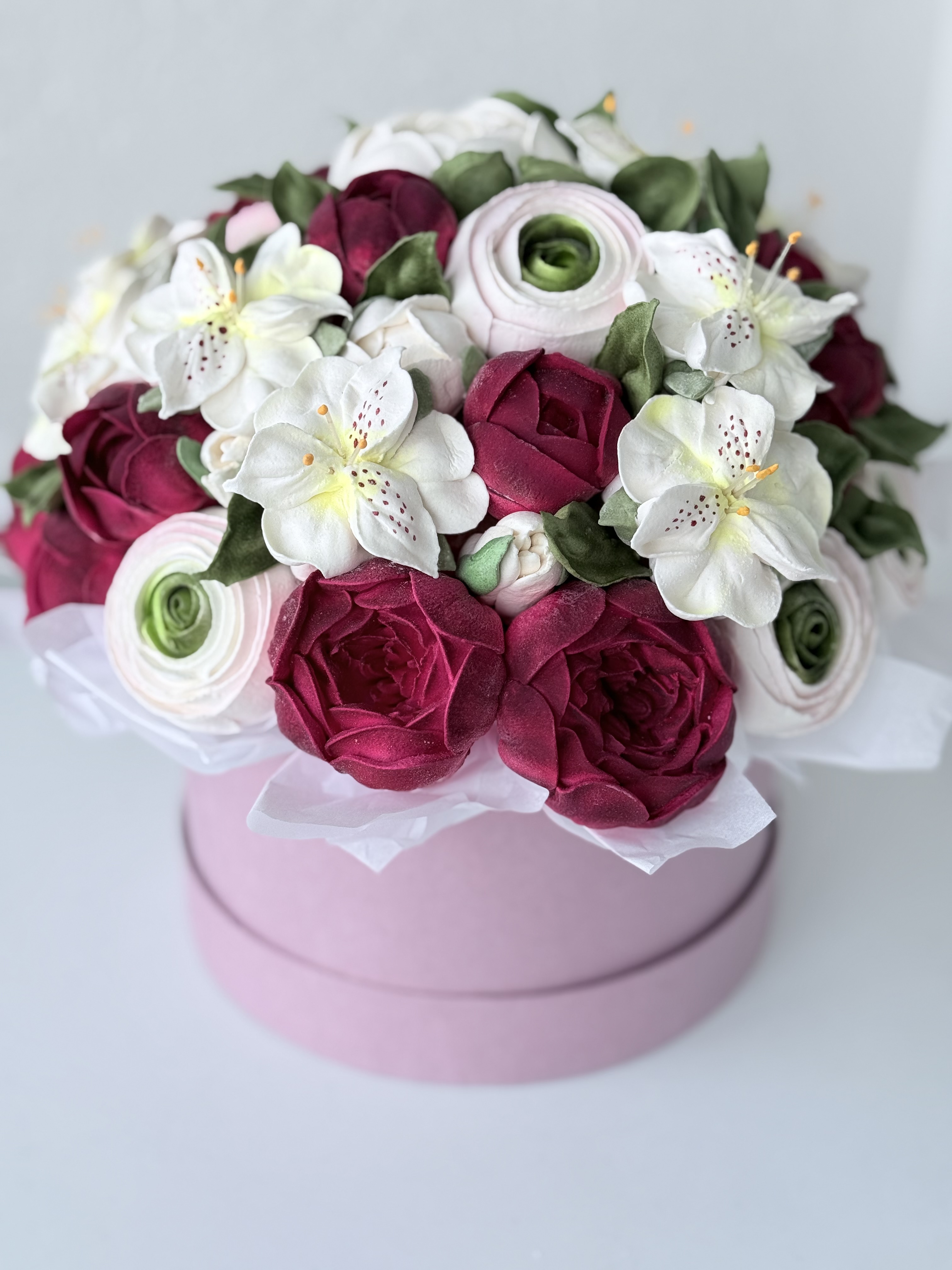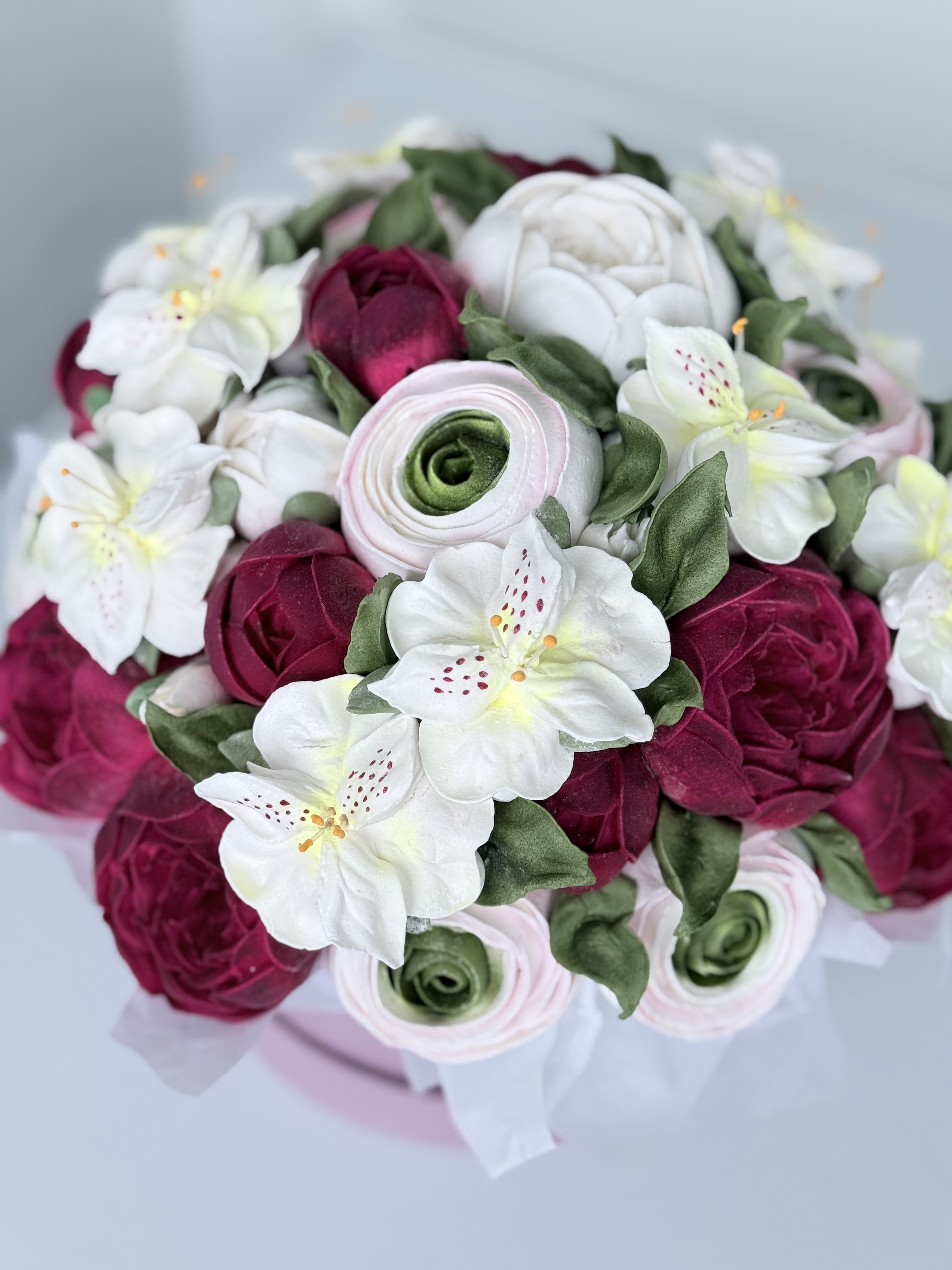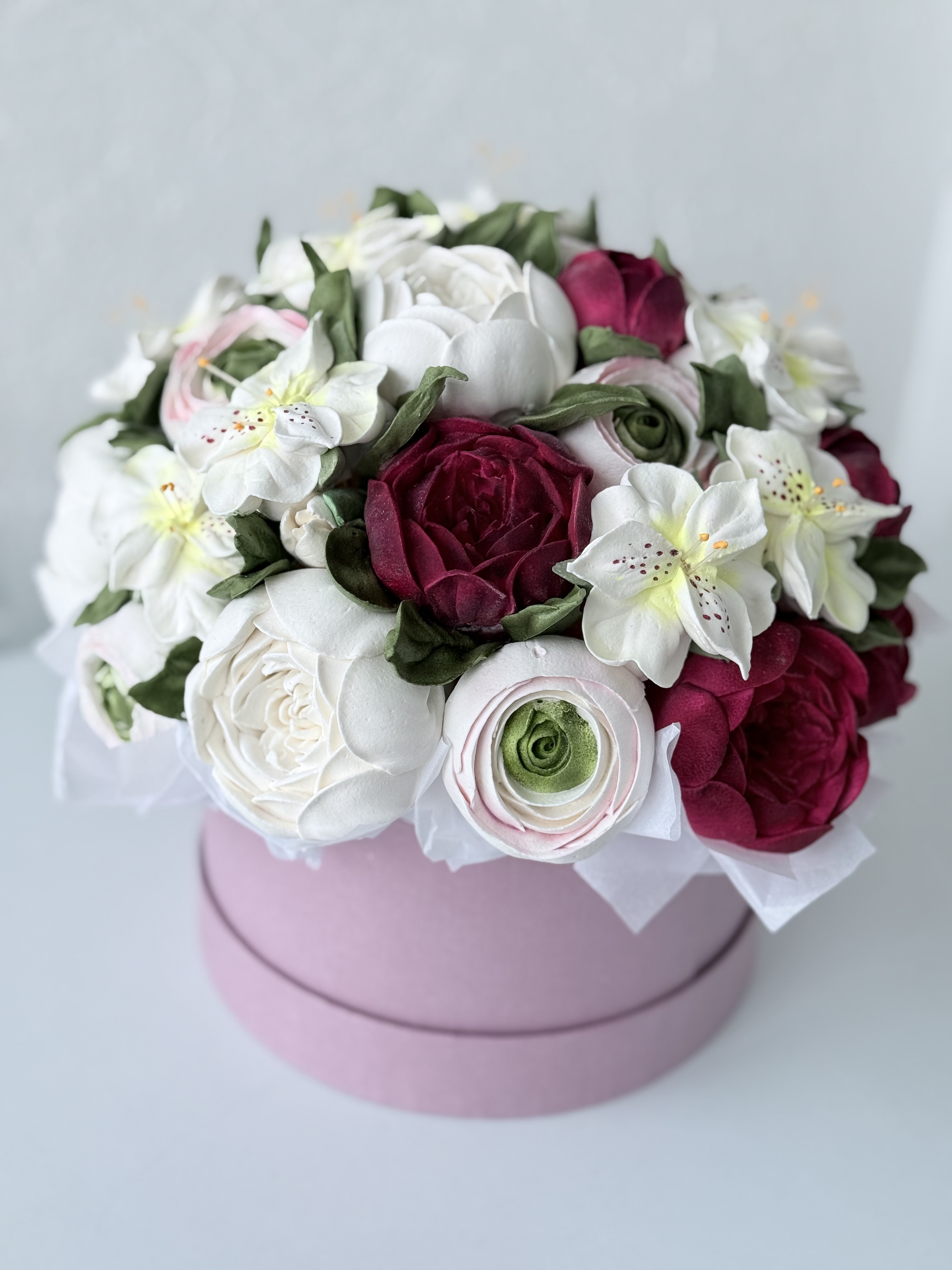 Букет цветов из зефира на яблочном пюре с уменьшенным содержанием сахара. Зефир нежный и воздушный. Диаметр коробки 20 см. Сверху объемная шапка из цветов. Цветы крепятся на зубочистки. Композиция упакована в прозрачную слюду для транспортировки.