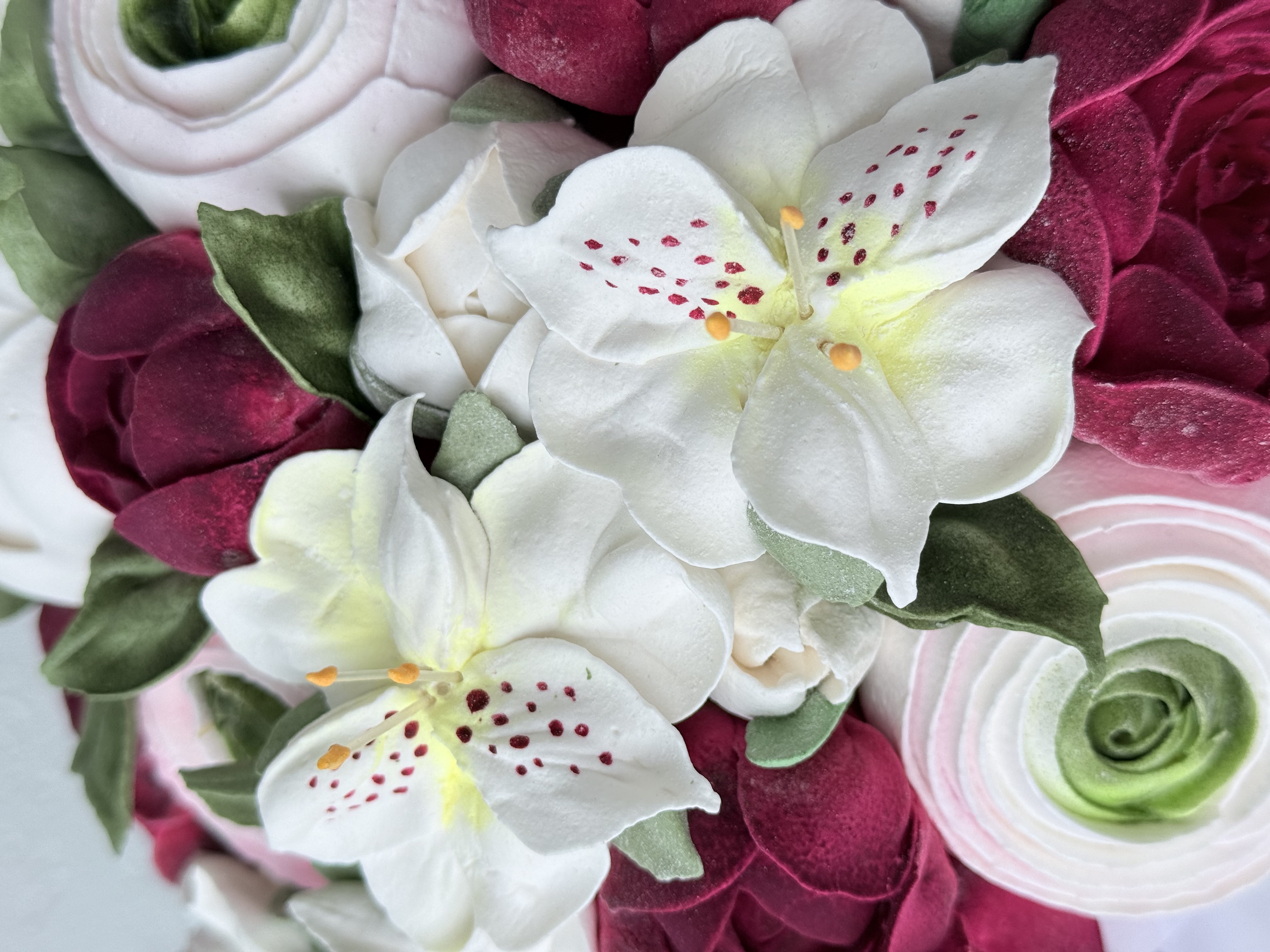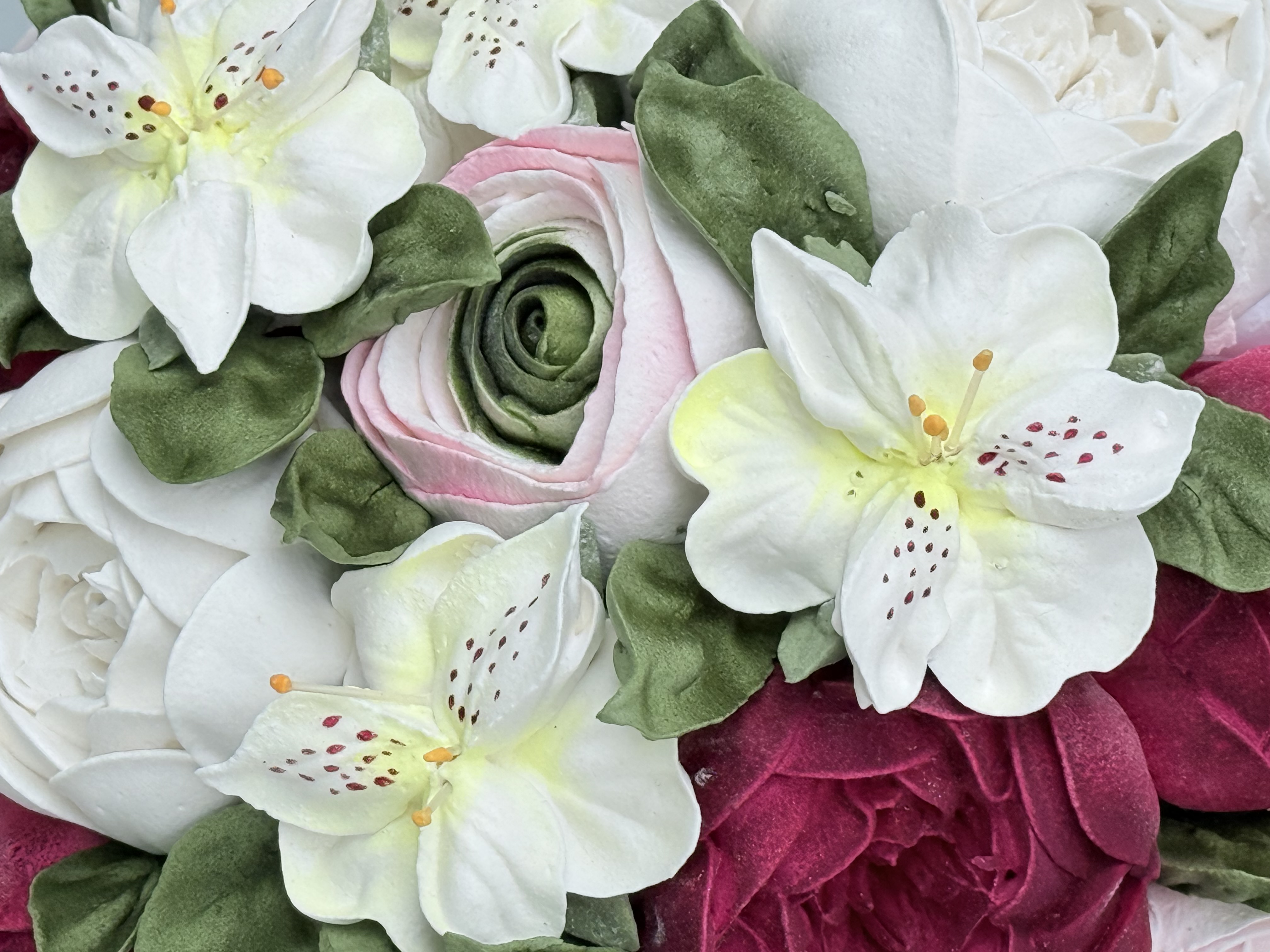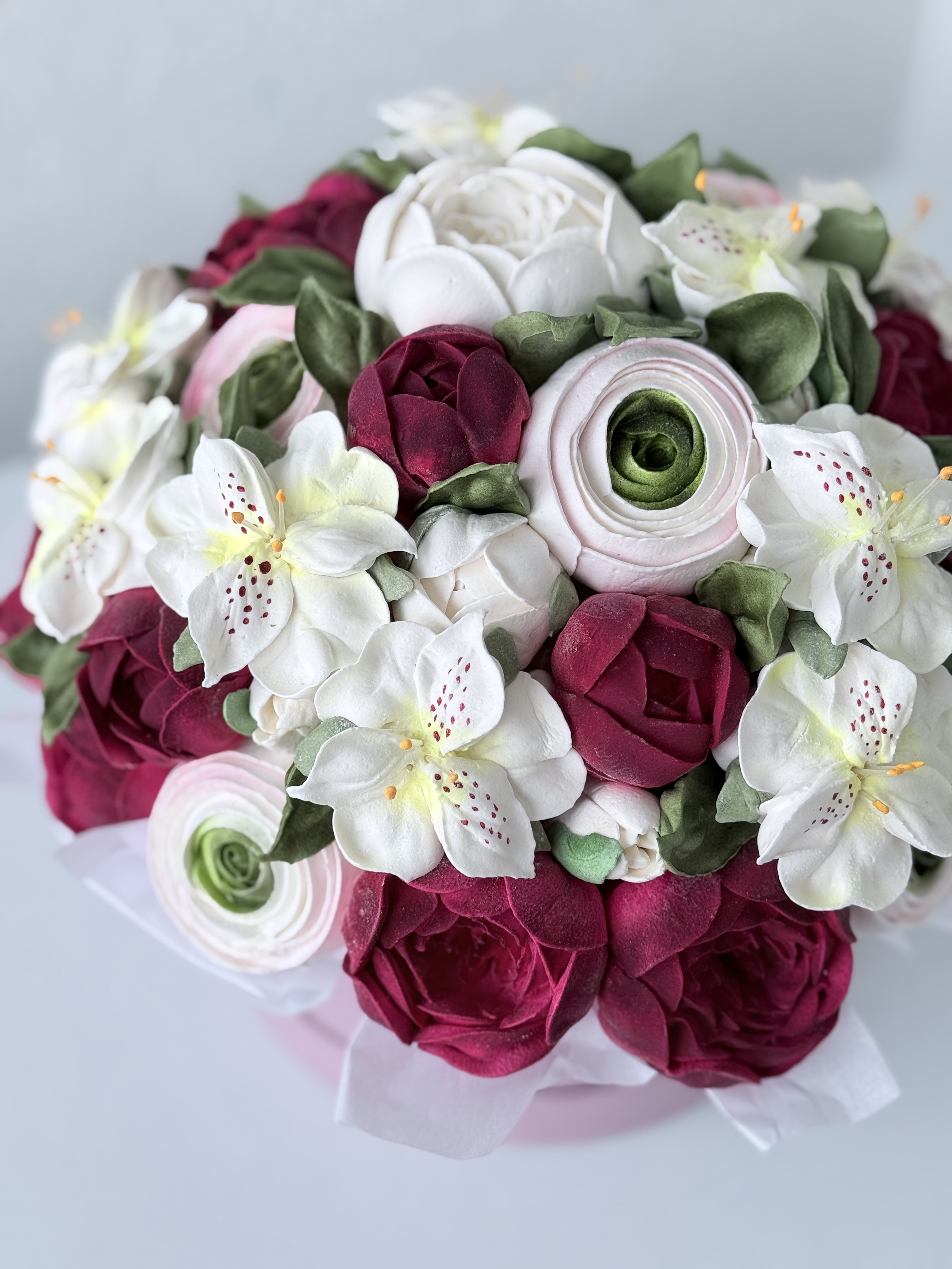 Букет цветов из зефира на яблочном пюре с уменьшенным содержанием сахара. Зефир нежный и воздушный. Диаметр коробки 20 см. Сверху объемная шапка из цветов. Цветы крепятся на зубочистки. Композиция упакована в прозрачную слюду для транспортировки.