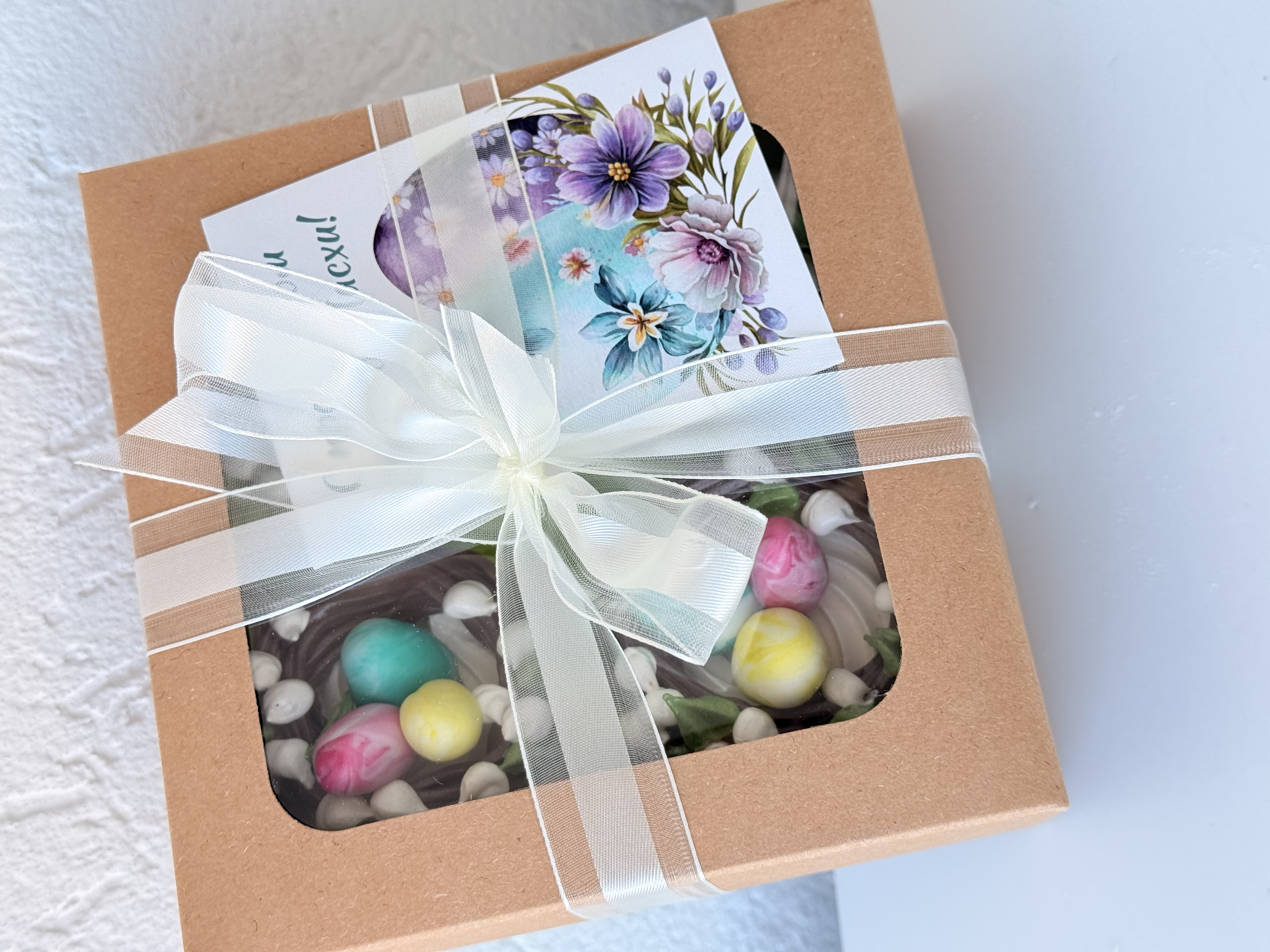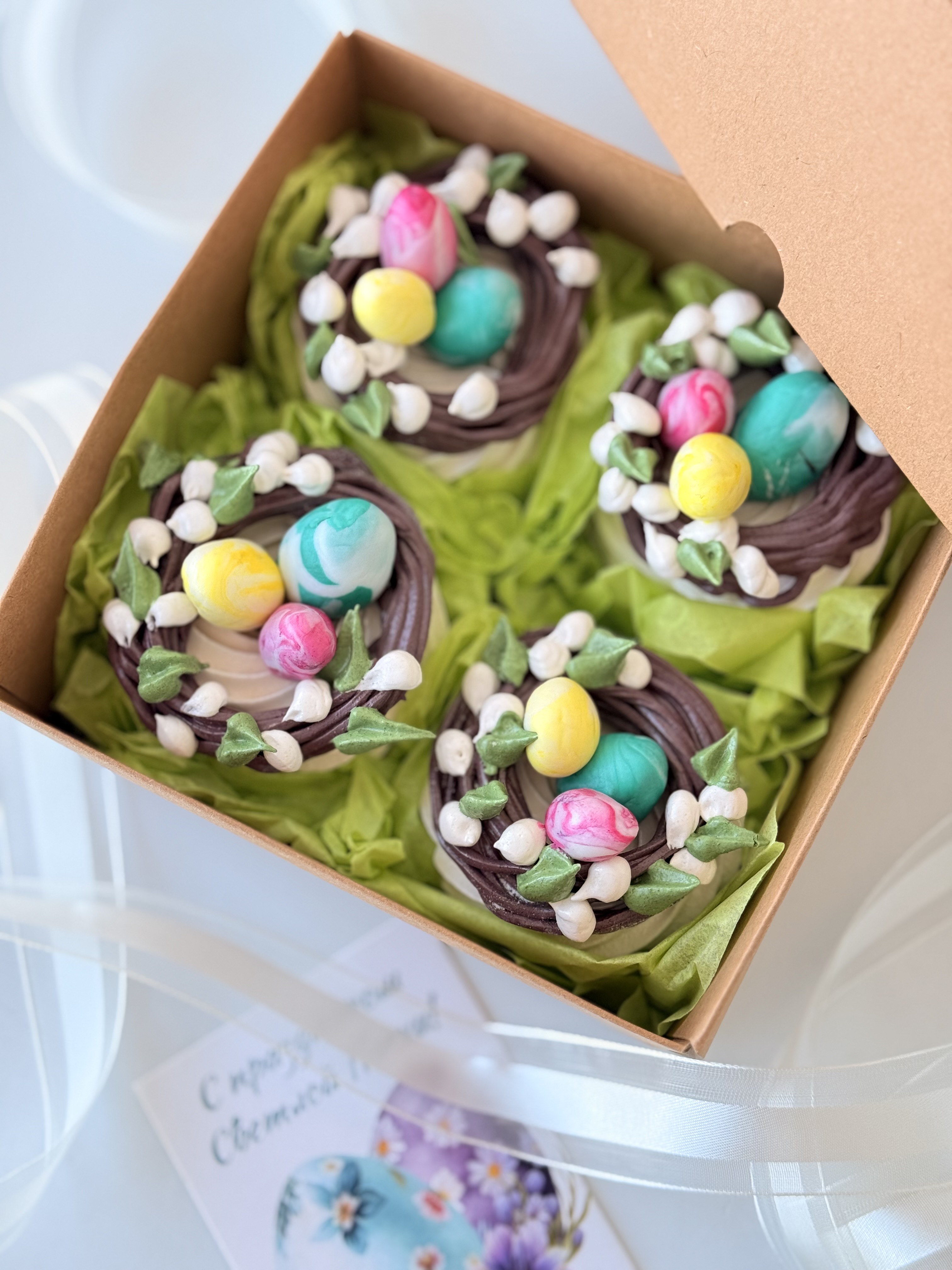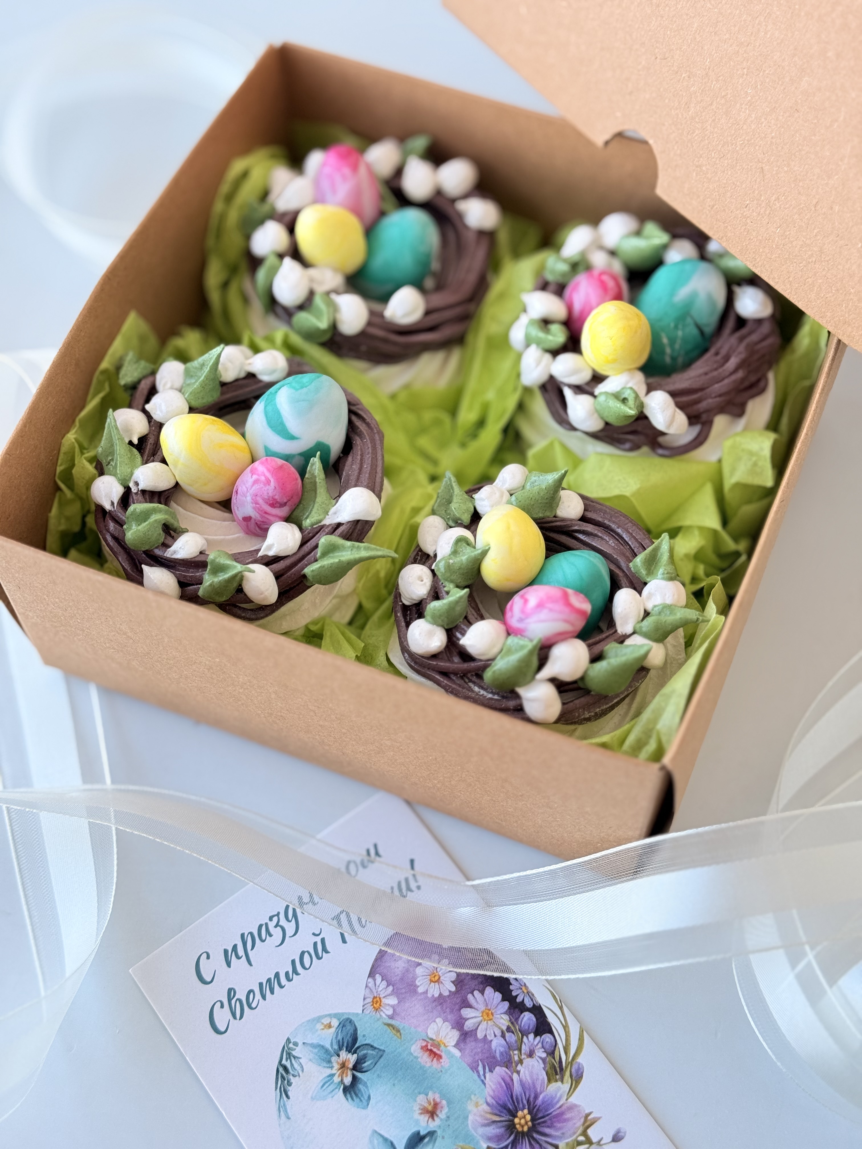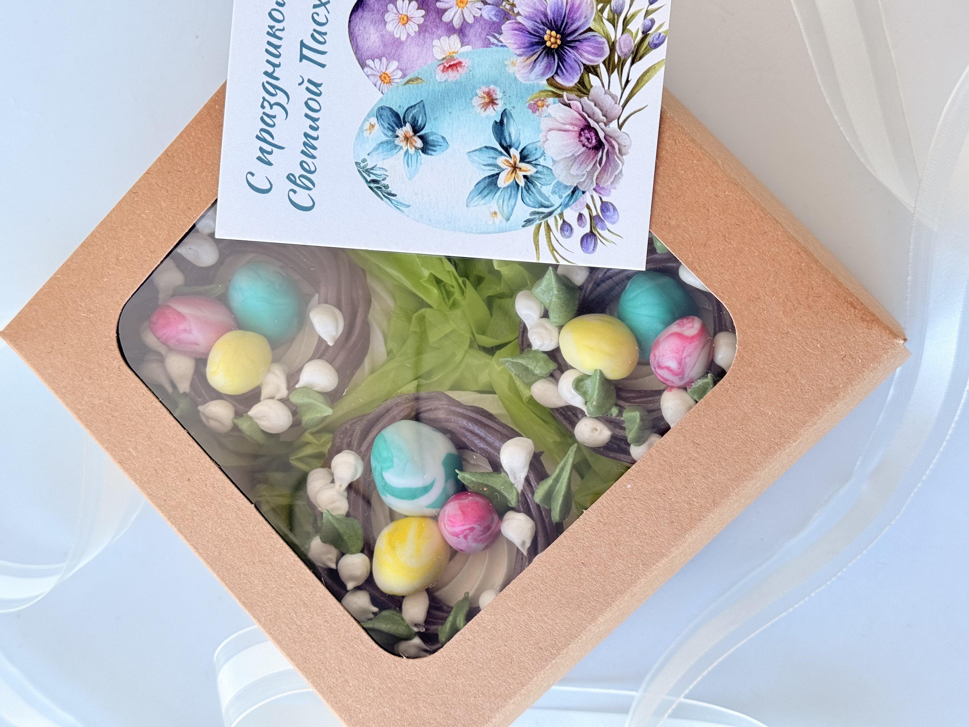Коробка 15*15 см с четырьмя гнездами из зефира на яблочном пюре, с уменьшенным содержанием сахара. Зефир нежный и воздушный. Яйца из сахарной мастики.
