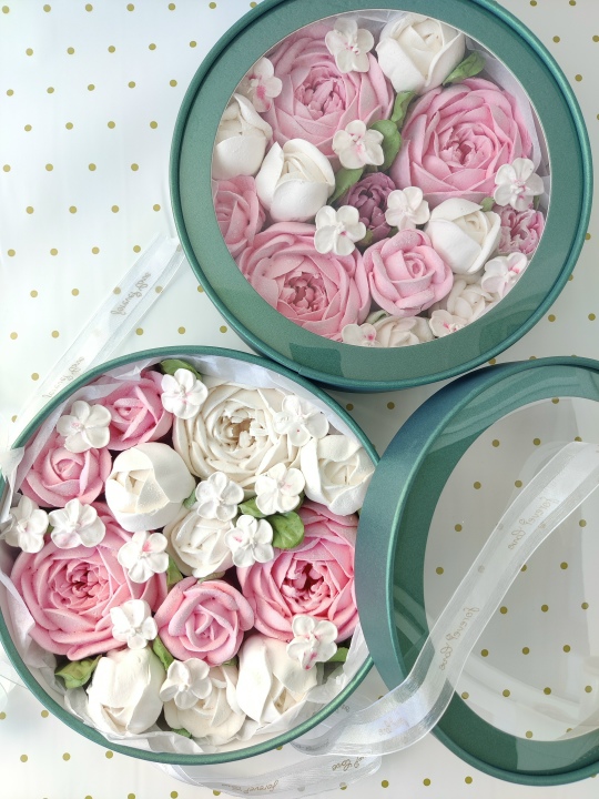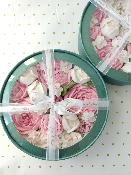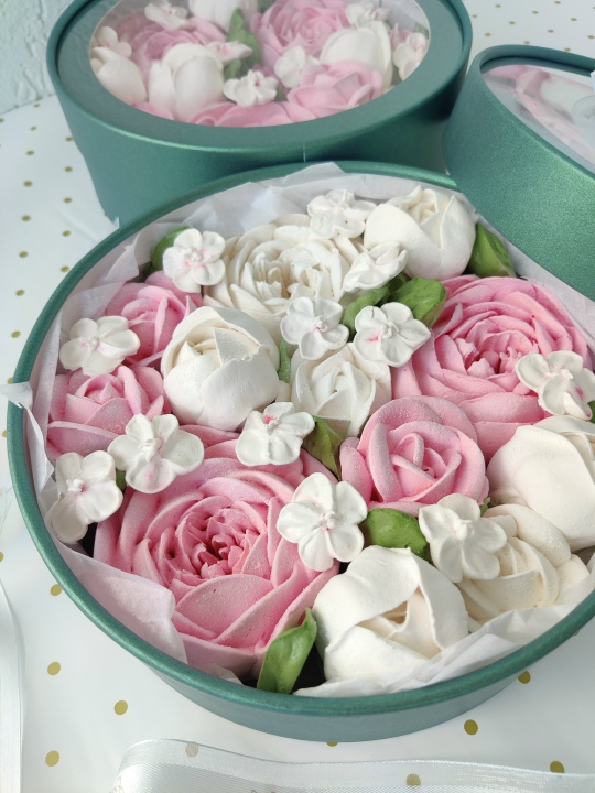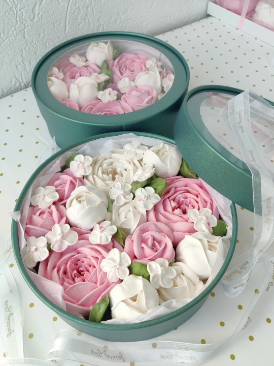 Коробочка диаметром 21 см с цветами из зефира на пюре из свежих яблок с уменьшенным содержанием сахара, зефир нежный и воздушный.