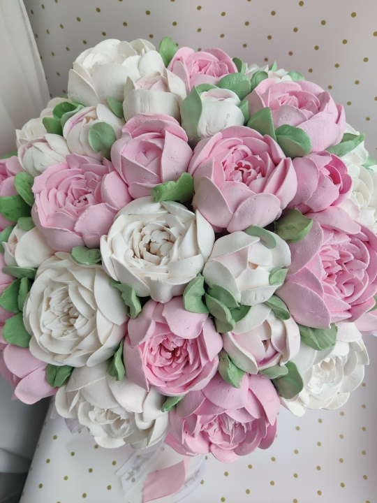 Букет пионов из зефира на пюре из свежих яблок с уменьшенным содержанием сахара. Зефир нежный и воздушный! Диаметр коробки 30 см. Срок хранения 14 дней. Заказ принимаю минимум за 3 дня!