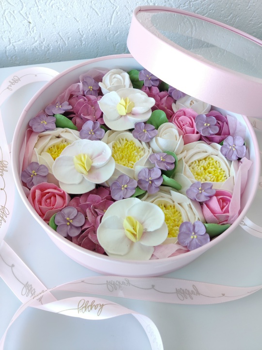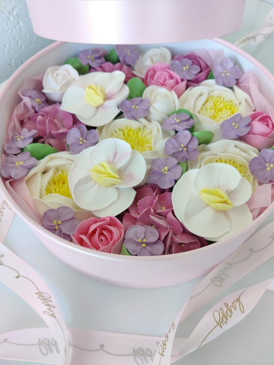 Коробочка d25 см с цветами из зефира на пюре из свежих яблок с уменьшенным содержанием сахара. Зефир нежный и воздушный.