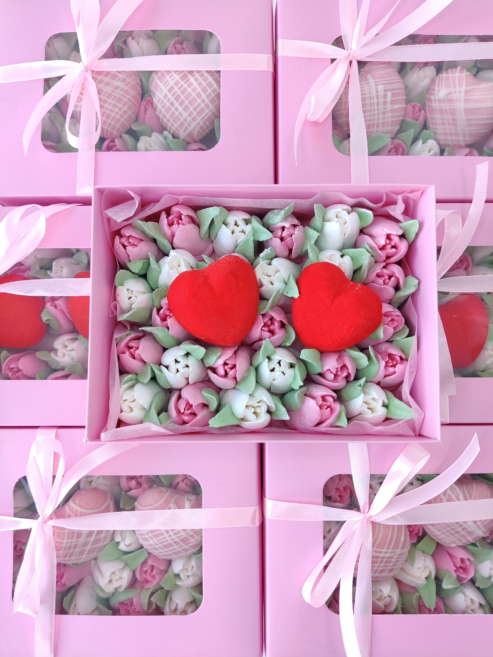 Коробка 16*12 см с тюльпанами и сердцами из зефира на яблочном пюре, с уменьшенным содержанием сахара. Зефир нежный и воздушный. В коробке 25 тюльпанов и 2 сердца.