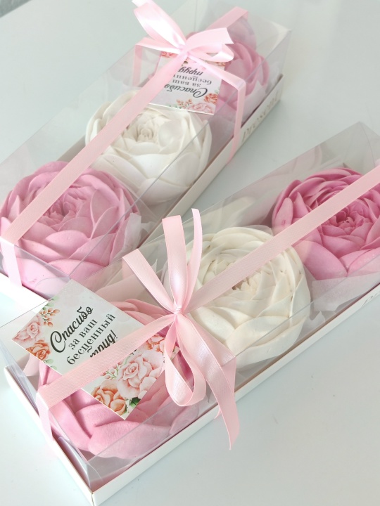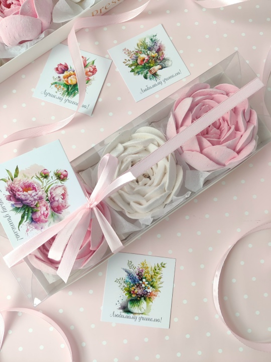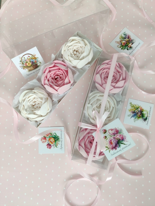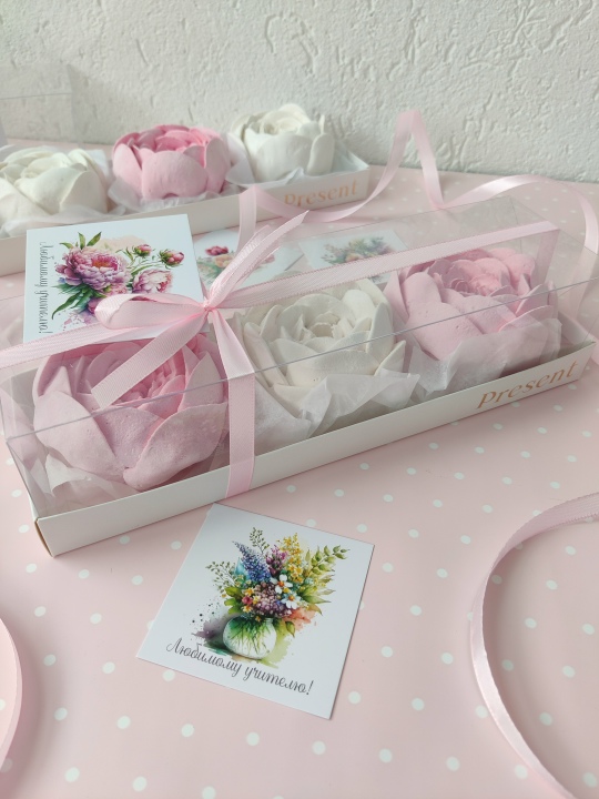 Коробочка 27*7 с пионами из зефира на пюре из свежих яблок, с уменьшенным содержанием сахара, зефир нежный и воздушный.