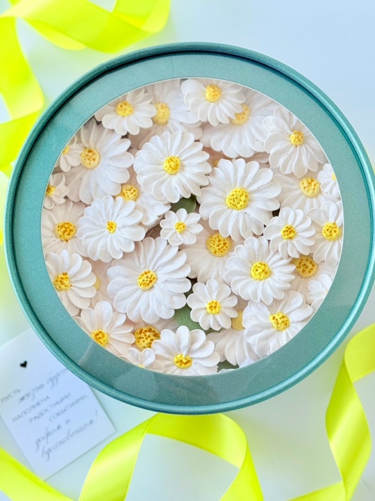 Коробочка 21 см с зефирными цветами. Ромашки лежат на зефирных завитках. Зефир на пюре из свежих яблок с уменьшенным содержанием сахара. Срок хранения 14 дней. Заказ минимум за 3 дня