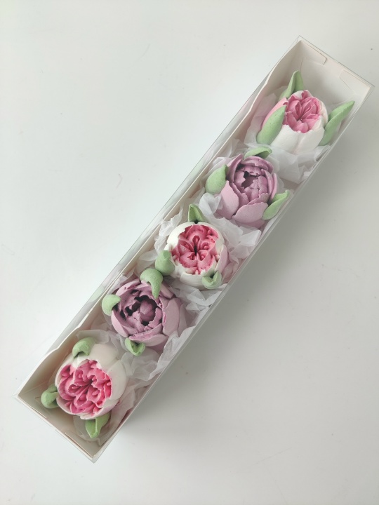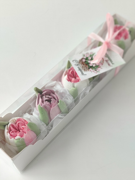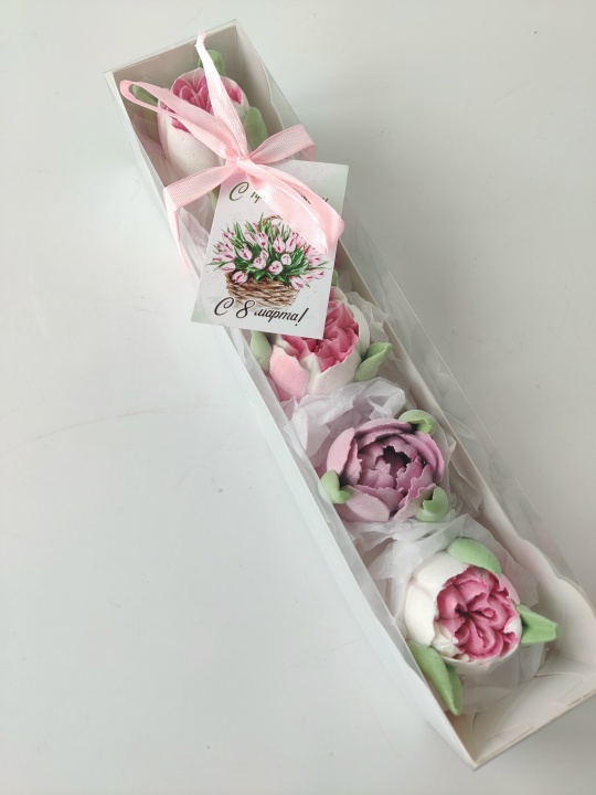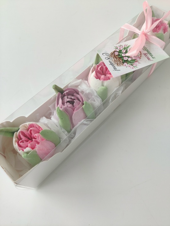 Коробочка с тюльпанами из зефира на пюре из свежих яблок с уменьшенным содержанием сахара. Зефир нежный и воздушный. Размер коробки 27*5,5*5,5.