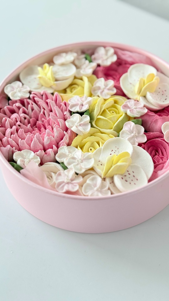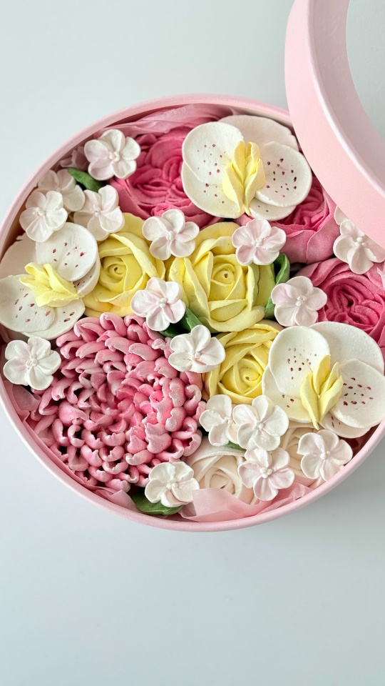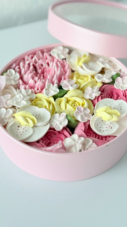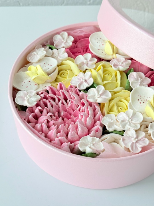 Коробочка d21 см h7 см с цветами из зефира по заварной технологии на яблочном пюре с уменьшенным содержанием сахара, очень нежный и воздушный.