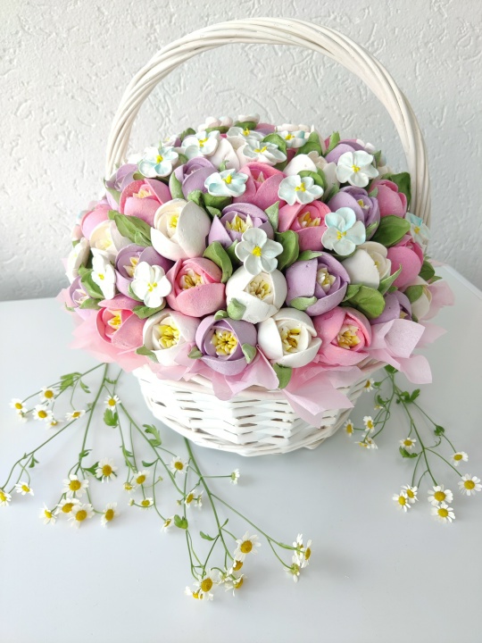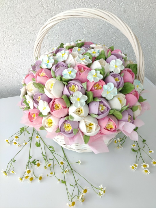 Цветочная композиция из зефира с уменьшенным содержанием сахара, на пюре из свежих яблок, без консервантов. Очень нежный и воздушный зефир.