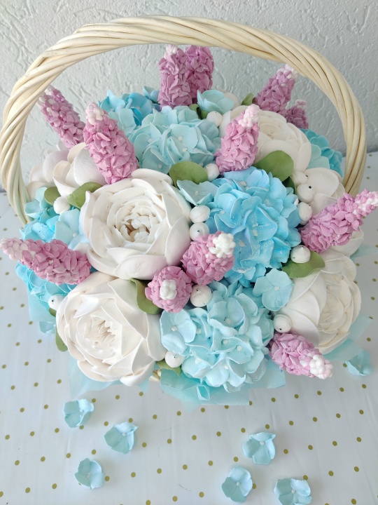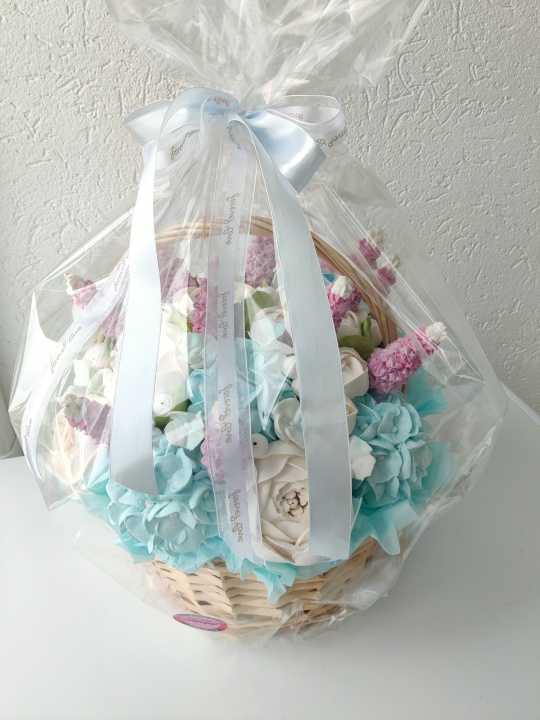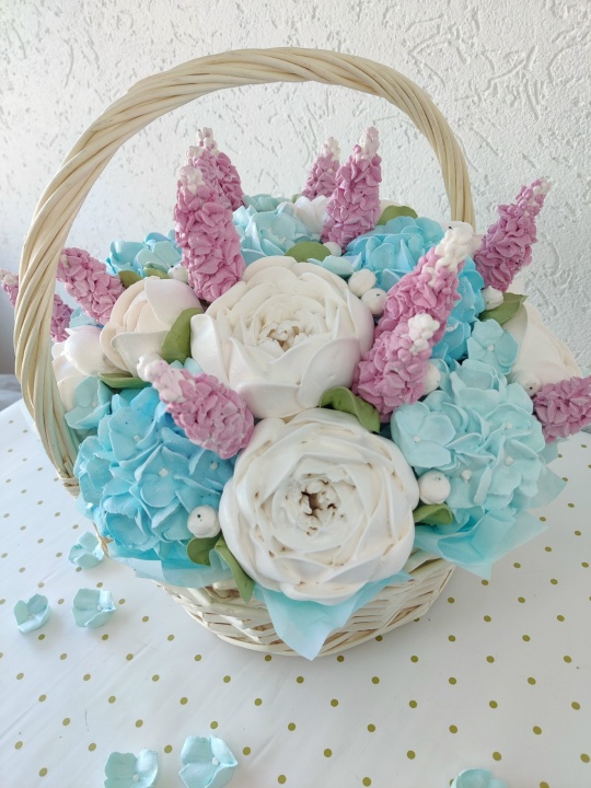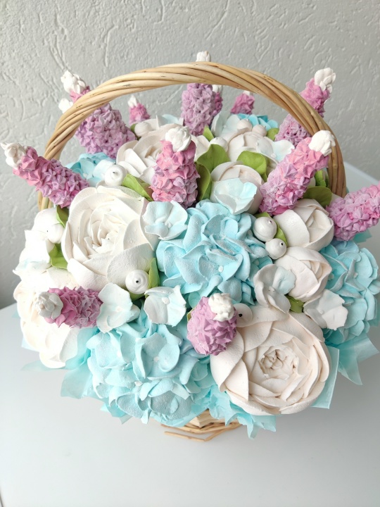 Букет цветов из зефира на пюре из свежих яблок с уменьшенным содержанием сахара. Зефир нежный и воздушный. Корзина диаметром 27 см.
