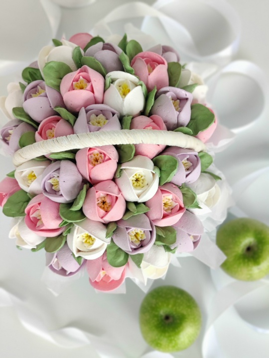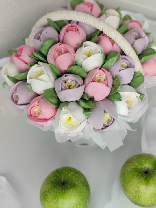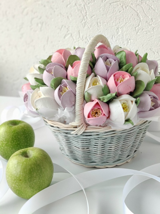 Корзина диаметр 18 см, высота с ручкой 21 см. Цветы из зефира на пюре из свежих яблок с уменьшенным содержанием сахара. Зефир нежный и воздушный.