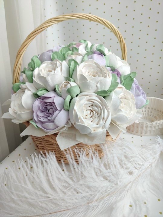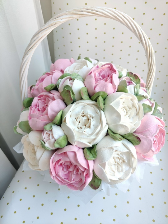 Букет пионов из зефира на пюре из свежих яблок, с уменьшенным содержанием сахара. Зефир нежный и воздушный. Заказ принимаю минимум за 3 дня до нужной вам даты. На пионы винного цвета к стоимости +10%.