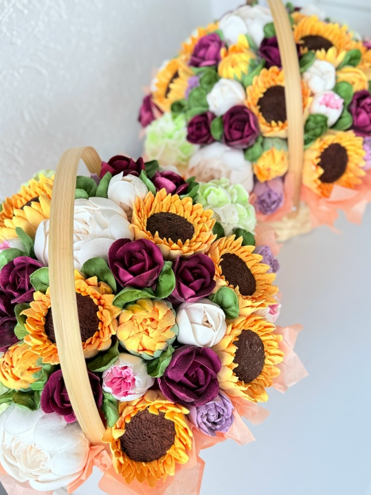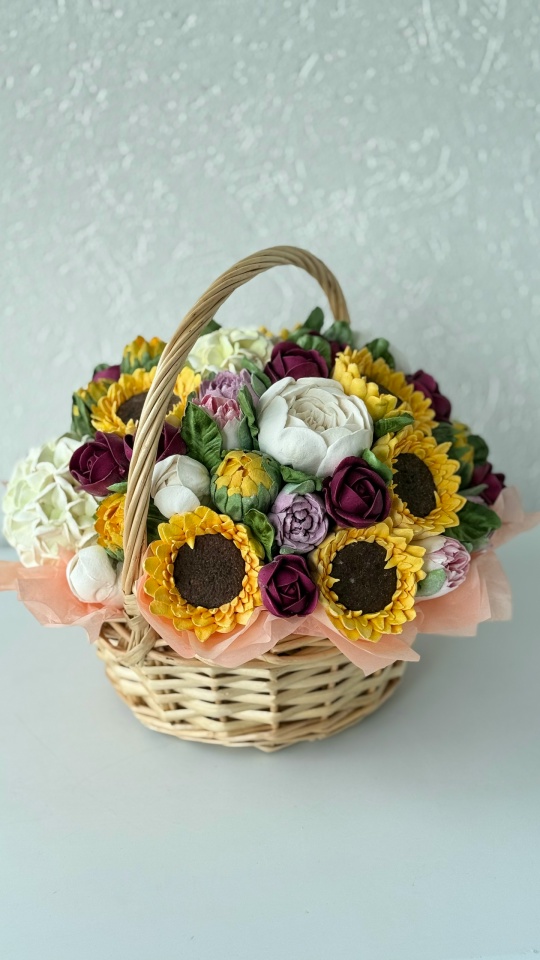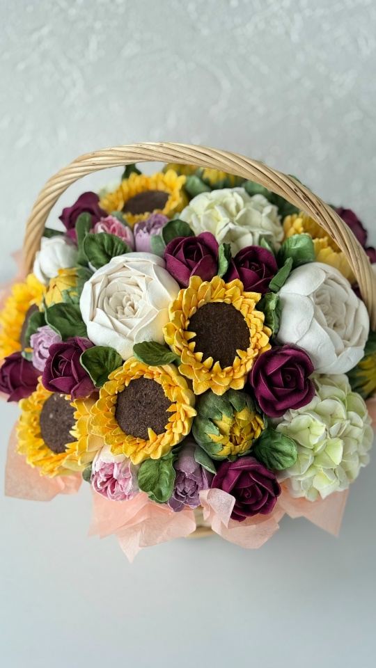Корзина с цветами из зефира на яблочном пюре. Зефир очень нежный и воздушный. Зефир не боится жары и холода, хорошо хранится, прекрасно подойдет в качестве альтернативы живым цветам. Цветочная шапка очень объемная. Возможно исполнения данной композиции в букете.
